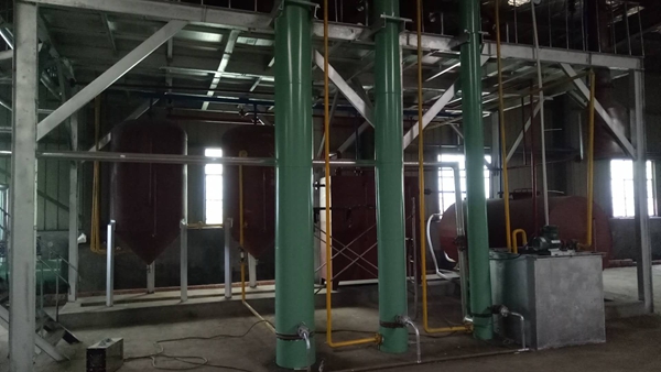 造粒后的含油白土由輸送機輸送至浸出罐上部的進料絞龍再由絞龍分料給浸出罐,當一個浸出罐達到一定料位時關閉這個進料閥打開另一個浸出罐進料閥,以此類推。第一個浸出罐料位達到關閉進料閥后,將預熱的新鮮溶劑打進這個浸出罐,進夠一定量的溶劑后打開混合油循環泵,經過一定時間循環浸泡后白土內的油脂被萃取出來,萃取得到的混合油由混合油泵打入混合油罐。